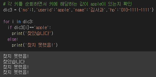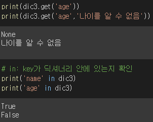 - in을 활용하여 딕셔너리 안에 값이 있는지 없는지 확인 가능