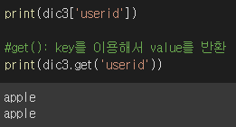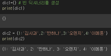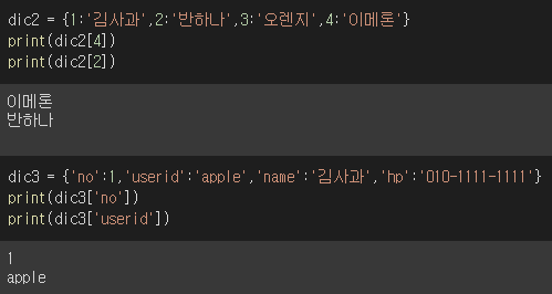 - 하나의 딕셔너리의 value는 중복될 수 있음