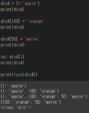 - 하나의 딕셔너리의 key는 중복될 수 없음