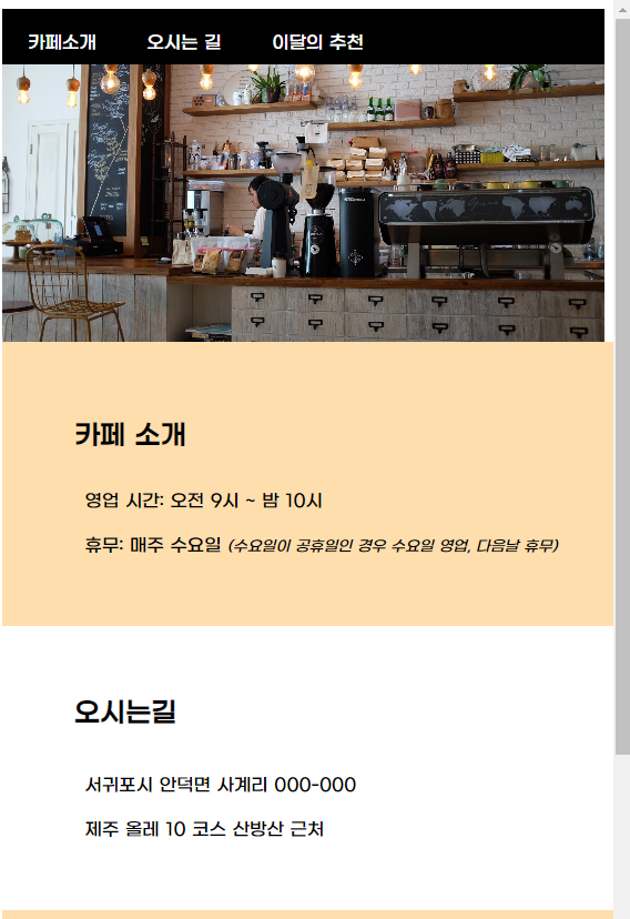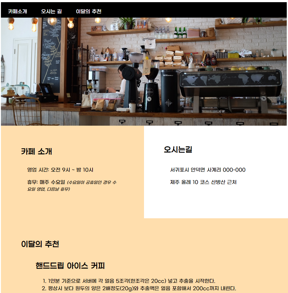 <body><div id="container"><header><nav><ul><li><a href="#intro"> 카페소개</a></li><li><a href="#map">오시는 길</a></li><li><a href="#choice">이달의 추천</a></li></ul></nav></header><section id="intro"><div class="page-title"><h2>카페 소개</h2></div><div class="content"><div class="photo"><img src="images/coffee.jpg" alt="커피"></div><div class="text"><p>영업 시간: 오전 9시 ~ 밤 10시</p><p>휴무: 매주 수요일 <i><small>(수요일이 공휴일인 경우 수요일 영업, 다음날 휴무)</small></i></p></div></div></section><section id="map"><div class="page-title"><h2>오시는길</h2></div><div class="content"><div class="photo"><img src="images/map.jpg" alt="지도"></div><div class="text"><p>서귀포시 안덕면 사계리 000-000</p><p>제주 올레 10 코스 산방산 근처</p></div></div></section><section id="choice"><div class="page-title"><h2>이달의 추천</h2></div><div class="content"><div class="photo"><img src="images/ice.jpg" alt="추천"></div><div class="text"><h2>핸드드립 아이스 커피</h2><ol><li>1인분 기준으로 서버에 각 얼음 5조각(한조각은 20cc) 넣고 추출을 시작한다.</li><li>평상시 보다 원두의 양은 2배정도(20g)와 추출액은 얼음 포함해서 200cc까지 내린다.</li><li>아이스 잔에 얼음 6~7개 섞어서 시원하게 마신다.</li></ol></div></div></section><footer><p>My times with Coffee</p></footer></div></body>