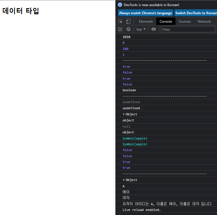 <!DOCTYPE html><html lang="en"><head><meta charset="UTF-8"><meta http-equiv="X-UA-Compatible" content="IE=edge"><meta name="viewport" content="width=device-width, initial-scale=1.0"><title>데이터 타입</title></head><body><h2>데이터 타입</h2><script>//number 형const num1 = 10;const num2 = 11.11;const num3 = 10e6;console.log(num1);console.log(num2);console.log(num3);console.log(typeof(num1));console.log(typeof(num2));console.log(typeof(num3));console.log('--------------------------------------------')
