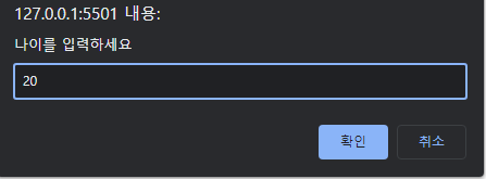 <!DOCTYPE html><html lang="en"><head><meta charset="UTF-8"><meta http-equiv="X-UA-Compatible" content="IE=edge"><meta name="viewport" content="width=device-width, initial-scale=1.0"><title>if문</title></head><body><script>const age = Number(prompt('나이를 입력하세요'));