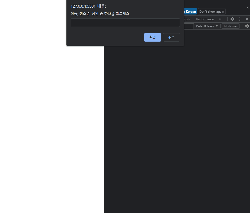 case '성인':input += ': 입장료 60,000원';break;default:alert('입력값을 확인하세요');input = '입력값 확인!'}