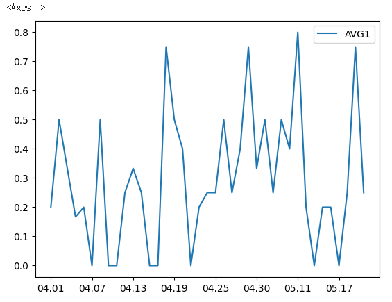 # '루타' 파생변수를 생성하여 열 계산하기# H:1, 2B:2, 3B:3, HR:4# 4월, 5월의 합계를 제거 후, 타율에 대한 날짜 라인 그래프를 생성df1['루타'] = df1['H'] + (df1['2B']*2) +(df1['3B']*3) +(df1['HR']*4)df1.plot(y = 'AVG1')