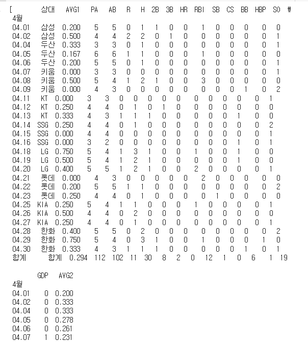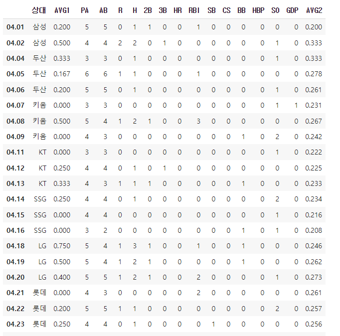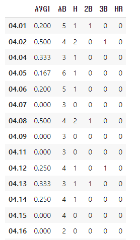 df1 = df1[['AVG1','AB', 'H', '2B', '3B', 'HR']].drop('합계')