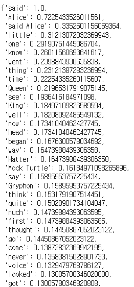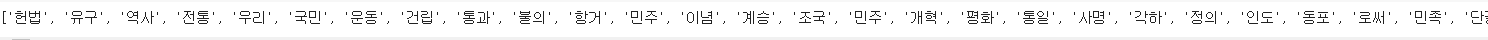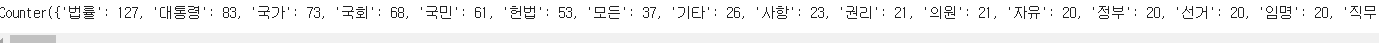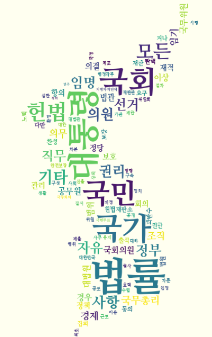 wordcloud = WordCloud(max_words=100,font_path='/usr/share/fonts/truetype/nanum/NanumMyeongjoExtraBold.ttf').generate(text)plt.figure(figsize=(15,10))plt.imshow(wordcloud)plt.axis('off')plt.show()# 불용어 등록. 워드 클라우드로 작성할 단어에서 제외할 단어를 설정from wordcloud import STOPWORDSprint(STOPWORDS)STOPWORDS.add('said') # 쓰지 않을 단어에 등록wordcloud = WordCloud(max_words=100,font_path='/usr/share/fonts/truetype/nanum/NanumMyeongjoExtraBold.ttf',stopwords=STOPWORDS).generate(text)plt.figure(figsize=(15,10))plt.imshow(wordcloud)plt.axis('off')plt.show()from PIL import Imageimport numpy as npalice_mask = np.array(Image.open('/content/drive/MyDrive/study/데이터분석/alice_mask.png'))alice_maskwordcloud = WordCloud(max_words=100,font_path='/usr/share/fonts/truetype/nanum/NanumMyeongjoExtraBold.ttf',stopwords=STOPWORDS,mask = alice_mask,background_color='ivory').generate(text)plt.figure(figsize=(15,10))plt.imshow(wordcloud)plt.axis('off')plt.show()!pip install konlpyfrom konlpy.corpus import kolawtext = kolaw.open('constitution.txt').read()from konlpy.tag import Oktokt = Okt()noun_text = okt.nouns(text)print(noun_text)noun_text.sort(key=lambda x: len(x))print(noun_text)stop_words = ['함','것','제','정','바','그']noun_text = [each_word for each_word in noun_text if each_word not in stop_words]print(noun_text)noun_text = [each_word for each_word in noun_text if len(each_word) > 1]print(noun_text)from collections import Countercount = Counter(noun_text)print(count)data = count.most_common(100)data = dict(data)print(len(data))print(data)# 딕셔너리에 저장된 데이터를 워드 클라우드로 생성하려면 generate_from_frequencies()를 사용wordcloud = WordCloud(max_words=100,font_path='/usr/share/fonts/truetype/nanum/NanumMyeongjoExtraBold.ttf').generate_from_frequencies(data)plt.figure(figsize=(15,10))plt.imshow(wordcloud)plt.axis('off')plt.show()mask = np.array(Image.open('/content/drive/MyDrive/study/데이터분석/korea_mask.jpg'))# 딕셔너리에 저장된 데이터를 워드 클라우드로 생성하려면 generate_from_frequencies()를 사용wordcloud = WordCloud(max_words=100,font_path='/usr/share/fonts/truetype/nanum/NanumMyeongjoExtraBold.ttf',background_color='ivory',mask=mask).generate_from_frequencies(data)plt.figure(figsize=(15,10))plt.imshow(wordcloud)plt.axis('off')plt.show()'데이터분석' 카테고리의 다른 글