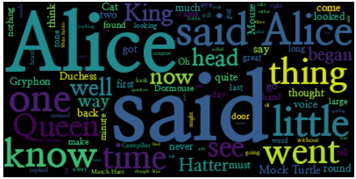 !pip install wordcloudfrom wordcloud import WordCloudtext = open('/content/drive/MyDrive/study/데이터분석/alice.txt').read()text# generate(): 단어별 출현 빈도수를 비율로 반환하는 객체를 생성wordcloud = WordCloud().generate(text)import matplotlib.pyplot as pltplt.figure(figsize=(15,10))plt.imshow(wordcloud)plt.axis('off')plt.show()# max_words: 워드 클라우드에 표시되는 단어의 개수를 설정wordcloud = WordCloud(max_words=100).generate(text)plt.figure(figsize=(15,10))plt.imshow(wordcloud)plt.axis('off')plt.show()import matplotlib.font_manager as fm