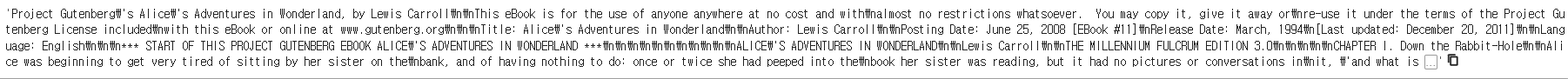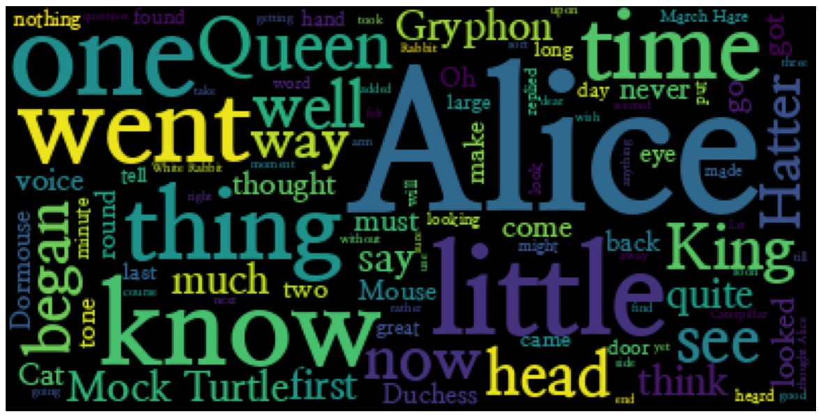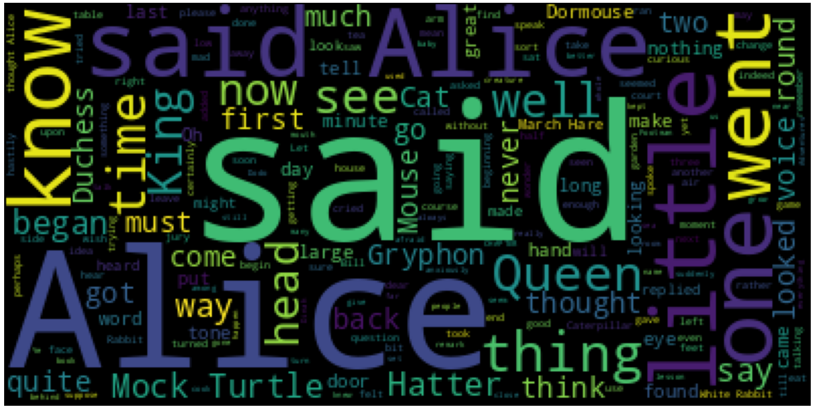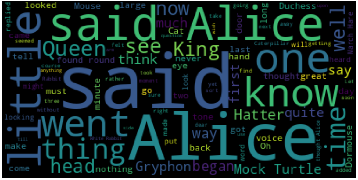 !pip install wordcloudfrom wordcloud import WordCloudtext = open('/content/drive/MyDrive/study/데이터분석/alice.txt').read()text