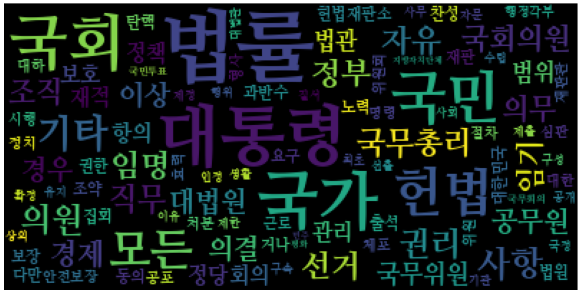 wordcloud = WordCloud(max_words=100,font_path='/usr/share/fonts/truetype/nanum/NanumMyeongjoExtraBold.ttf').generate(text)plt.figure(figsize=(15,10))plt.imshow(wordcloud)plt.axis('off')plt.show()