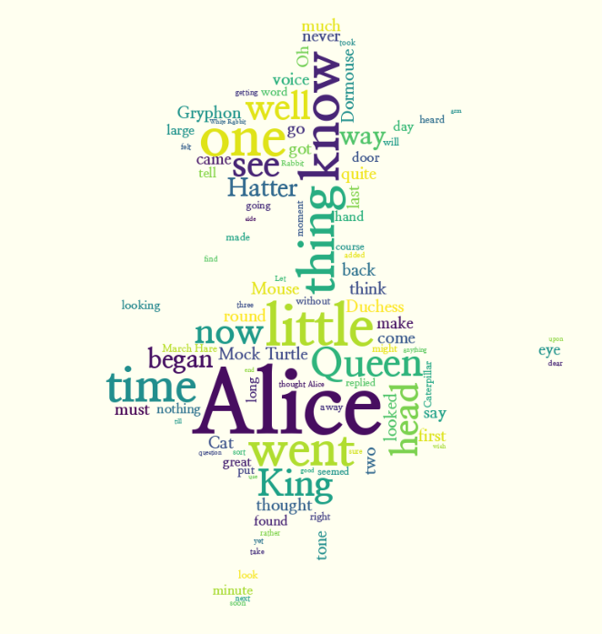 wordcloud = WordCloud(max_words=100,font_path='/usr/share/fonts/truetype/nanum/NanumMyeongjoExtraBold.ttf',stopwords=STOPWORDS,mask = alice_mask,background_color='ivory').generate(text)plt.figure(figsize=(15,10))plt.imshow(wordcloud)plt.axis('off')plt.show()