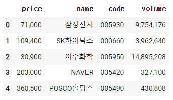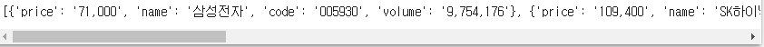 dic = {'price':price, 'name':name, 'code':code, 'volume':volume}