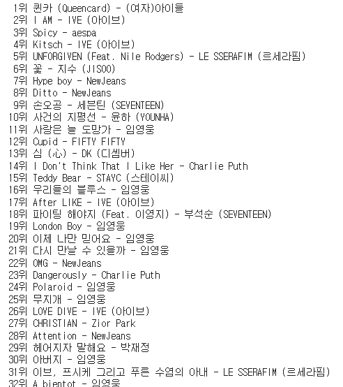 print('{0:3d}위 {1} - {2}'.format(i+1, title, artist))