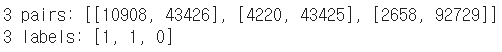 # skip_grams[0]에 skipgrams로 형성된 데이터셋 확인pairs, labels = skip_grams[0][0], skip_grams[0][1]print(f'3 pairs: {pairs[:3]}')print(f'3 labels: {labels[:3]}')