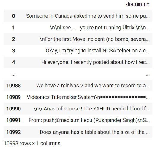 import pandas as pdimport numpy as npfrom sklearn.datasets import fetch_20newsgroups#예제 데이터셋#헤더,풋터,인용구 지우고 가져오겠다.dataset = fetch_20newsgroups(shuffle=True, random_state=10,remove=('headers','footers','quotes'))dataset= dataset.data# document 필드를 가진 데이터 프레임으로 변환news_df = pd.DataFrame({'document':dataset})news_df