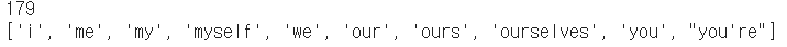 import nltkfrom nltk.corpus import stopwordsnltk.download('stopwords')stop_words = stopwords.words('english')print(len(stop_words))print(stop_words[:10])