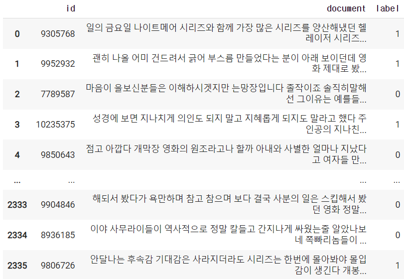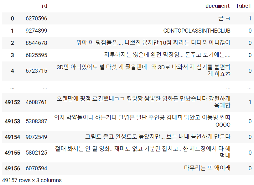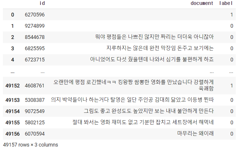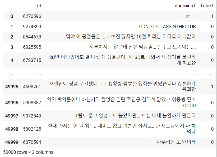- 리뷰가 긍정인 경우 1, 부정인 경우 0으로 표시한 레이블로 구성되어 있음