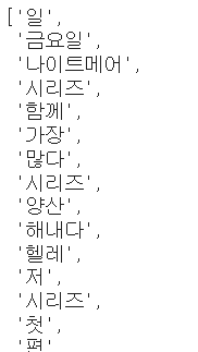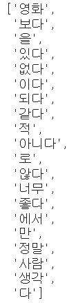 stopwords = ['의', '가', '이', '은', '들', '는', '좀', '잘', '걍', '과', '도', '를', '으로', '자', '에', '와', '한', '하다']