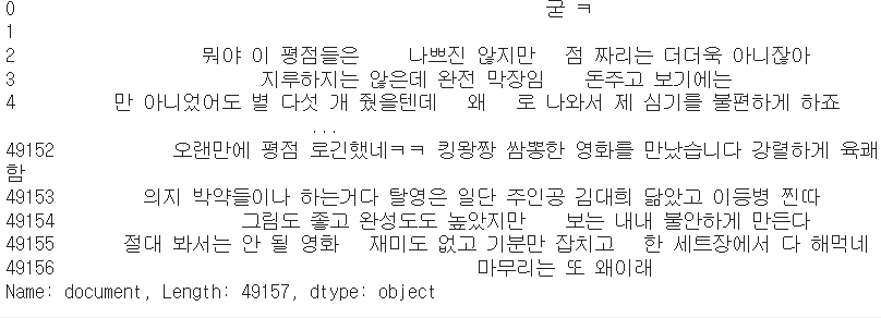 train_dataset['document'] = train_dataset['document'].str.replace('[^ㄱ-ㅎㅏ-ㅣ가-힣]', ' ')