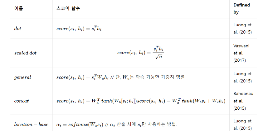 - 인코더의 시점을 각각 1, 2, ..n 이라고 했을 때 인코더의 각 셀에 대한 hidden state를 각각 h1, h2, ..hn이라고 하고 디코더의 현재 시점 t에서 해당 셀의 hidden state를 St