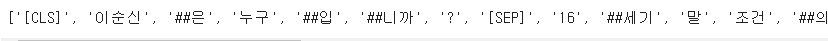 text = '[CLS] 이순신은 누구입니까? [SEP] 16세기 말 조건의 명장이자 충무공이며 임진왜란 및 정유재란 당시 조선 수군을 지휘했던 제독이다. [SEP]'