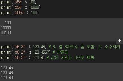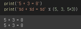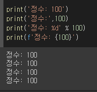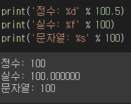 - %d(정수), %f(실수), %s(문자열)를 사용하여 출력 서식을 지정