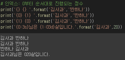- format 함수를 사용할때 순서는 왼쪽부터 0부터이다.