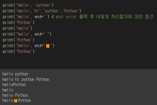 - end를 이용해 개행을 없애거나 원하는 문자를 입력 가능하다.