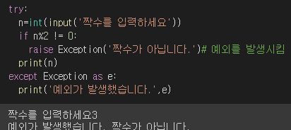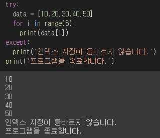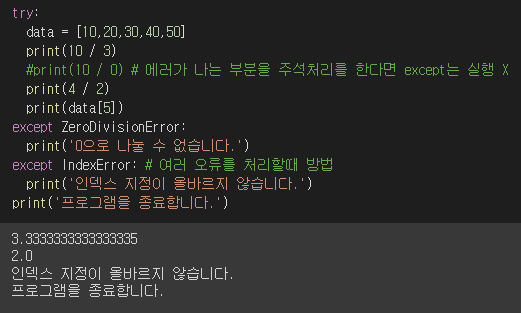 - 오류가 발생될 것으로 예상되는 문장을 try 블록에 코딩하고, try블록에 코딩된 내용을 실행하다가 오류가 발생하면 더이상 try블록의 내용을 실행하지 않고 해당 오류의 except 블롣에 코딩된 내용을 실행