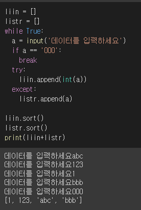 - 데이터를 입력하면 정렬하여 오름차순 출력하는 프로그램을 작성해보자.(단, 숫자와 문자를 섞어 입력하면 숫자 + 문자 형식으로 정렬, 000을 입력하면 정렬을 시작함)