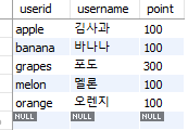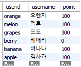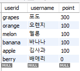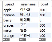 - 포인트가 100이상 300이하인 회원의 userid, username, point를 출력