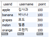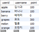 - 포인트가 100이상 300이하인 회원의 userid, username, point를 출력