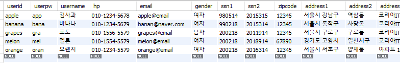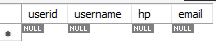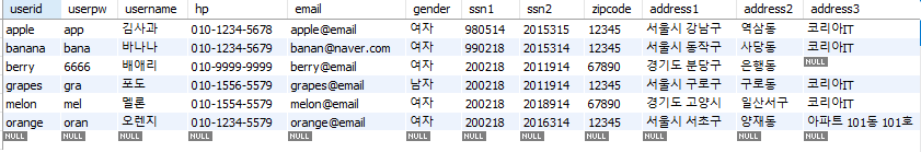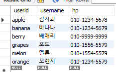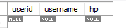 - select userid, username, hp from member where address1 is null; -- O # null값인 것을 출력
