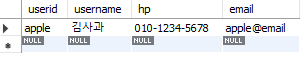 - select userid, username, hp, email from member where userid = 'apple' and userpw = '1234';