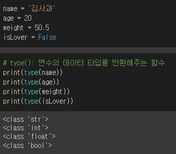 - type(): 함수를 이용해 변수의 타입을 확인할 수 있다.