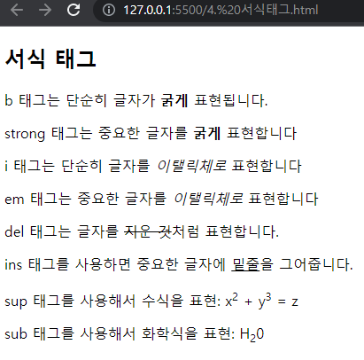 <p>b 태그는 단순히 글자가 <b>굵게</b> 표현됩니다.</p>