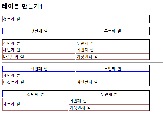 <!DOCTYPE html><html lang="en"><head><meta charset="UTF-8"><meta http-equiv="X-UA-Compatible" content="IE=edge"><meta name="viewport" content="width=device-width, initial-scale=1.0"><title>테이블 만들기1</title><style>table{width: 600px; border:1px solid black;}td{border: 1px solid rgb(168, 104, 104);}th{border: 1px solid blue;}</style></head><body><h2>테이블 만들기1</h2><table><tr><td>첫번째 셀</td></tr></table><hr><table><tr><th>첫번째 셀</th><th>두번째 셀</th></tr></table><hr><table><tr><td>첫번째 셀</td><td>두번째 셀</td></tr><tr><td>세번째 셀</td><td>네번째 셀</td></tr><tr><td>다섯번째 셀</td><td>여섯번째 셀</td></tr></table><hr><table><tr><th>첫번째 셀</th><th>두번째 셀</th></tr><tr><td colspan="2">세번째 셀</td></tr><tr><td>다섯번째 셀</td><td>여섯번째 셀</td></tr></table><hr><table><tr><th>첫번째 셀</th><th>두번째 셀</th></tr><tr><td rowspan="2">세번째 셀</td><td>네번째 셀</td></tr><tr><td>여섯번째 셀</td></tr></table></body></html>