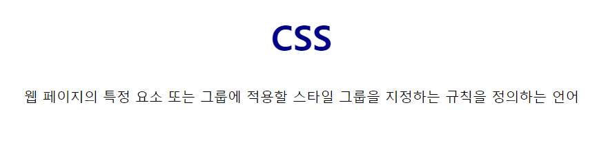 <!DOCTYPE html><html lang="en"><head><meta charset="UTF-8"><meta http-equiv="X-UA-Compatible" content="IE=edge"><meta name="viewport" content="width=device-width, initial-scale=1.0"><title>CSS</title><style>h2{ text-align: center; font-size: 50px; color: darkblue;}p{ text-align: center; font-size: 20px;}</style></head><body><h2>CSS</h2><p>웹 페이지의 특정 요소 또는 그룹에 적용할 스타일 그룹을 지정하는 규칙을 정의하는 언어</p></body></html>