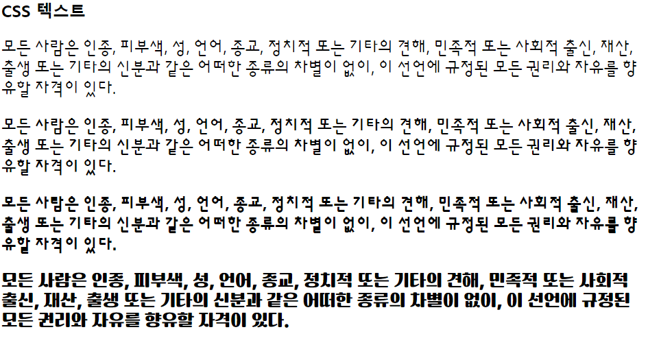<!DOCTYPE html><html lang="en"><head><meta charset="UTF-8"><meta http-equiv="X-UA-Compatible" content="IE=edge"><meta name="viewport" content="width=device-width, initial-scale=1.0"><title>CSS 텍스트</title><link href="https://fonts.googleapis.com/css2?family=Sunflower:wght@300;500;700&display=swap" rel="stylesheet"><style>p{font-size: 24px;}.sunflower1{font-family: 'Sunflower', sans-serif; font-weight: 300;}.sunflower2{font-family: 'Sunflower', sans-serif; font-weight: 500;}.sunflower3{font-family: 'Sunflower', sans-serif; font-weight: 700;}@font-face {font-family: 'TTTtangsbudaejjigaeB';src: url('https://cdn.jsdelivr.net/gh/projectnoonnu/noonfonts_2212@1.0/TTTtangsbudaejjigaeB.woff2') format('woff2');font-weight: 700;font-style: normal;}.budaejjigae{font-family: 'TTTtangsbudaejjigaeB'; font-weight: 300;}</style></head><body><h2>CSS 텍스트</h2><p class="sunflower1">모든 사람은 인종, 피부색, 성, 언어, 종교, 정치적 또는 기타의 견해, 민족적 또는 사회적 출신, 재산, 출생 또는 기타의 신분과 같은 어떠한 종류의 차별이 없이, 이 선언에 규정된 모든 권리와 자유를 향유할 자격이 있다.</p><p class="sunflower2">모든 사람은 인종, 피부색, 성, 언어, 종교, 정치적 또는 기타의 견해, 민족적 또는 사회적 출신, 재산, 출생 또는 기타의 신분과 같은 어떠한 종류의 차별이 없이, 이 선언에 규정된 모든 권리와 자유를 향유할 자격이 있다.</p><p class="sunflower3">모든 사람은 인종, 피부색, 성, 언어, 종교, 정치적 또는 기타의 견해, 민족적 또는 사회적 출신, 재산, 출생 또는 기타의 신분과 같은 어떠한 종류의 차별이 없이, 이 선언에 규정된 모든 권리와 자유를 향유할 자격이 있다.</p><p class="budaejjigae">모든 사람은 인종, 피부색, 성, 언어, 종교, 정치적 또는 기타의 견해, 민족적 또는 사회적 출신, 재산, 출생 또는 기타의 신분과 같은 어떠한 종류의 차별이 없이, 이 선언에 규정된 모든 권리와 자유를 향유할 자격이 있다.</p></body></html>