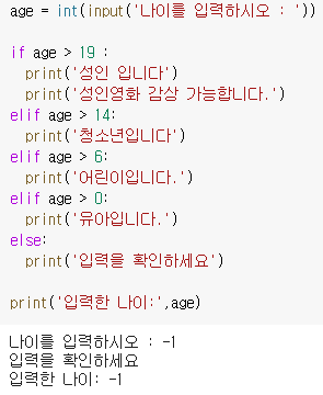 if 조건식1(결과가 True 또는 False가 나오는 문장): 조건식이 True인 경우 실행할 문장 ... elif 조건식2: 조건식2가 True인 경우 실행할 문장 elif 조건식3: 조건식3가 True인 경우 실행할 문장 else: 조건식이 False 인 경우 실행할 문장 ...