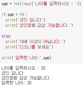 - 항상 코드는 위에서 아래로 실행되며 if 먼저 실행이 되고 조건에 만족하지 않을때 else가 실행된다.