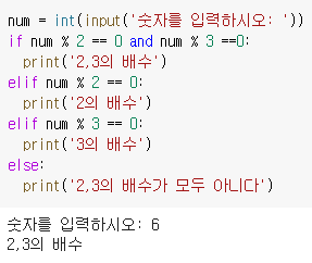 - 숫자를 입력받아 2의 배수인지, 3의 배수인지 아니면 2,3의 배수가 모두 아닌지를 판별하는 프로그램을 작성해보자