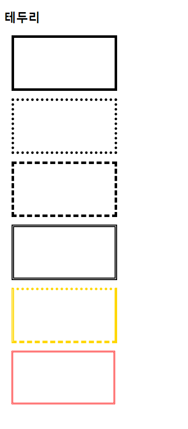 <!DOCTYPE html><html lang="en"><head><meta charset="UTF-8"><meta http-equiv="X-UA-Compatible" content="IE=edge"><meta name="viewport" content="width=device-width, initial-scale=1.0"><title>테두리</title><style>div{width: 200px;height: 100px;margin: 15px;border-width: 5px;color: black;}#border1{border-style: solid;}#border2{border-style: dotted;}#border3{border-style: dashed;}#border4{border-style: double;}#border5{border-top-style: dotted;border-right-style: solid;border-bottom-style: dashed;border-left-style: double;border-color: gold;}#border6{border: 3px double red;}