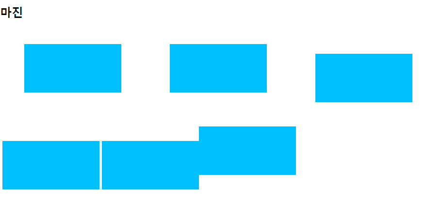 <!DOCTYPE html><html lang="en"><head><meta charset="UTF-8"><meta http-equiv="X-UA-Compatible" content="IE=edge"><meta name="viewport" content="width=device-width, initial-scale=1.0"><title>마진</title><style>body{padding:0; margin: 0;}div{float: left;width: 200px;height: 100px;background-color: deepskyblue;}#margin1{margin: 30px 50px 30px 50px;}#margin2{margin: 30px 50px ;}#margin3{margin: 50px ;}#margin4{margin: 30px 5px 10px ;}#margin5{margin: 30px auto ;}</style></head><body><h2>마진</h2><div id="margin1"></div><div id="margin2"></div><div id="margin3"></div><div id="margin4"></div><div id="margin5"></div><div id="margin6"></div></body></html>