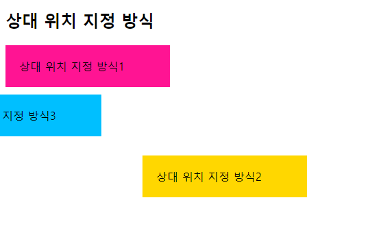 }</style></head><body><h2>상대 위치 지정 방식</h2><div class="relative1">상대 위치 지정 방식1</div><div class="relative2">상대 위치 지정 방식2</div><div class="relative3">상대 위치 지정 방식3</div></body></html>