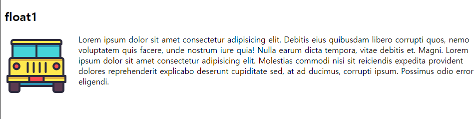 <!DOCTYPE html><html lang="en"><head><meta charset="UTF-8"><meta http-equiv="X-UA-Compatible" content="IE=edge"><meta name="viewport" content="width=device-width, initial-scale=1.0"><title>float1</title><style>img{float: left;margin-right: 20px;}</style></head><body><h2>float1</h2><img src="image/bus.png" alt="버스">Lorem ipsum dolor sit amet consectetur adipisicing elit. Debitis eius quibusdam libero corrupti quos, nemo voluptatem quis facere, unde nostrum iure quia! Nulla earum dicta tempora, vitae debitis et. Magni. Lorem ipsum dolor sit amet consectetur adipisicing elit. Molestias commodi nisi sit reiciendis expedita provident dolores reprehenderit explicabo deserunt cupiditate sed, at ad ducimus, corrupti ipsum. Possimus odio error eligendi.</body></html>