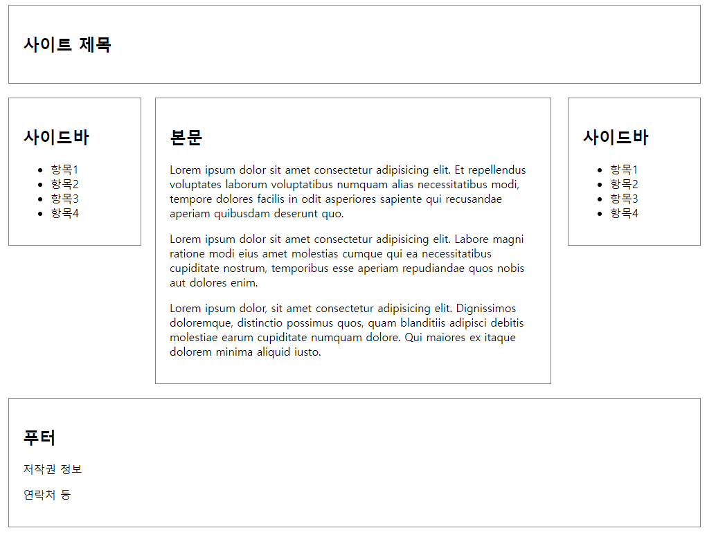 <div id="left-sidebar"><h2>사이드바</h2><ul><li>항목1</li><li>항목2</li><li>항목3</li><li>항목4</li></ul></div><div id="contents"><h2>본문</h2><p>Lorem ipsum dolor sit amet consectetur adipisicing elit. Et repellendus voluptates laborum voluptatibus numquam alias necessitatibus modi, tempore dolores facilis in odit asperiores sapiente qui recusandae aperiam quibusdam deserunt quo.</p><p>Lorem ipsum dolor sit amet consectetur adipisicing elit. Labore magni ratione modi eius amet molestias cumque qui ea necessitatibus cupiditate nostrum, temporibus esse aperiam repudiandae quos nobis aut dolores enim.</p><p>Lorem ipsum dolor, sit amet consectetur adipisicing elit. Dignissimos doloremque, distinctio possimus quos, quam blanditiis adipisci debitis molestiae earum cupiditate numquam dolore. Qui maiores ex itaque dolorem minima aliquid iusto.</p></div>